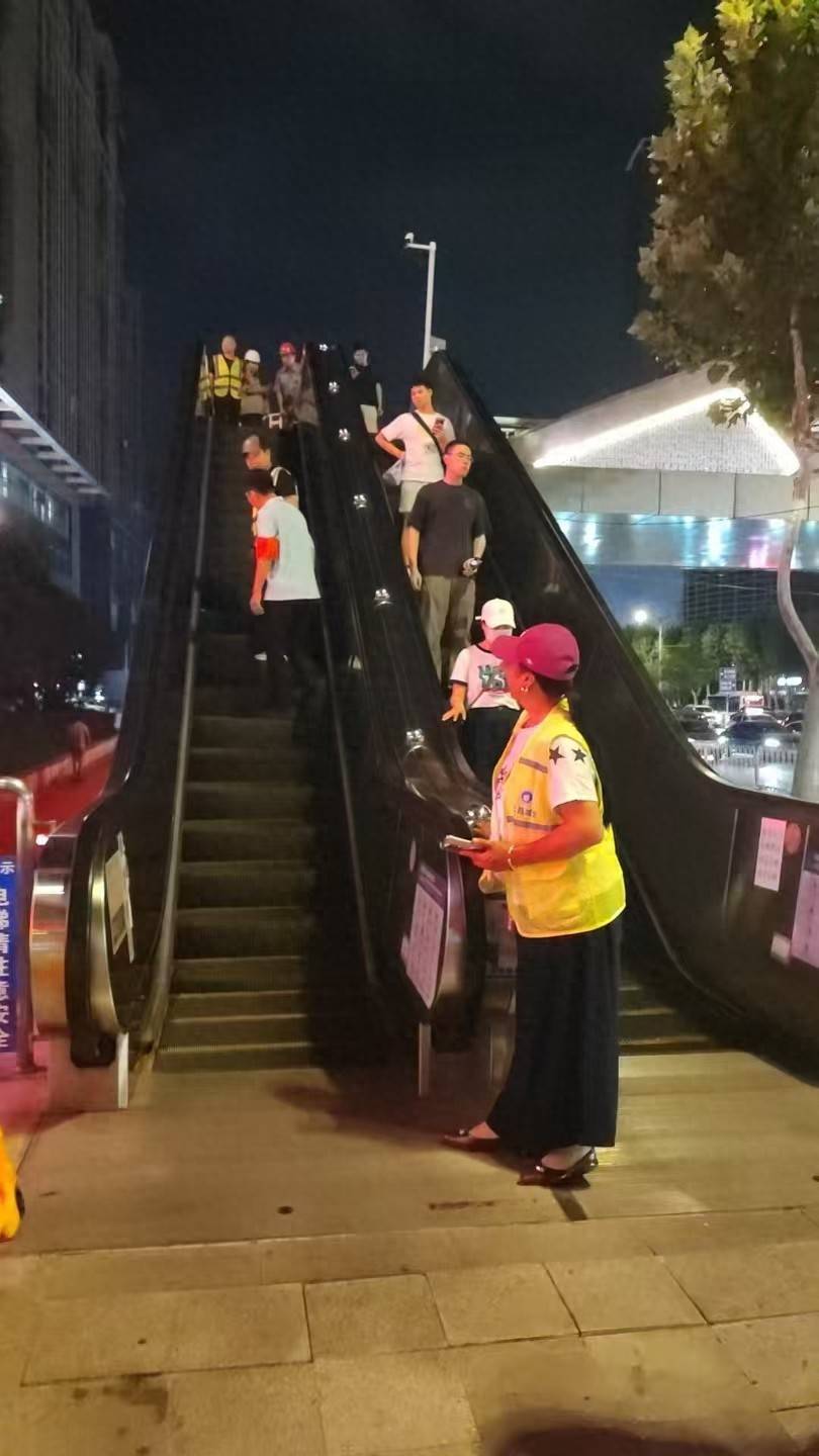 本次演练模拟了“螺丝钉卡入自动扶梯缝隙导致电梯骤停”的突发场景,完整呈现了从事故发生到恢复运行的全流程应急处置。工作人员巡查发现中南路人行天桥自动扶梯上行电梯异常停止,立即启动紧急制动程序并迅速设置安全警戒线,放置“电梯暂停使用”警示牌,防止乘客误入危险区域。